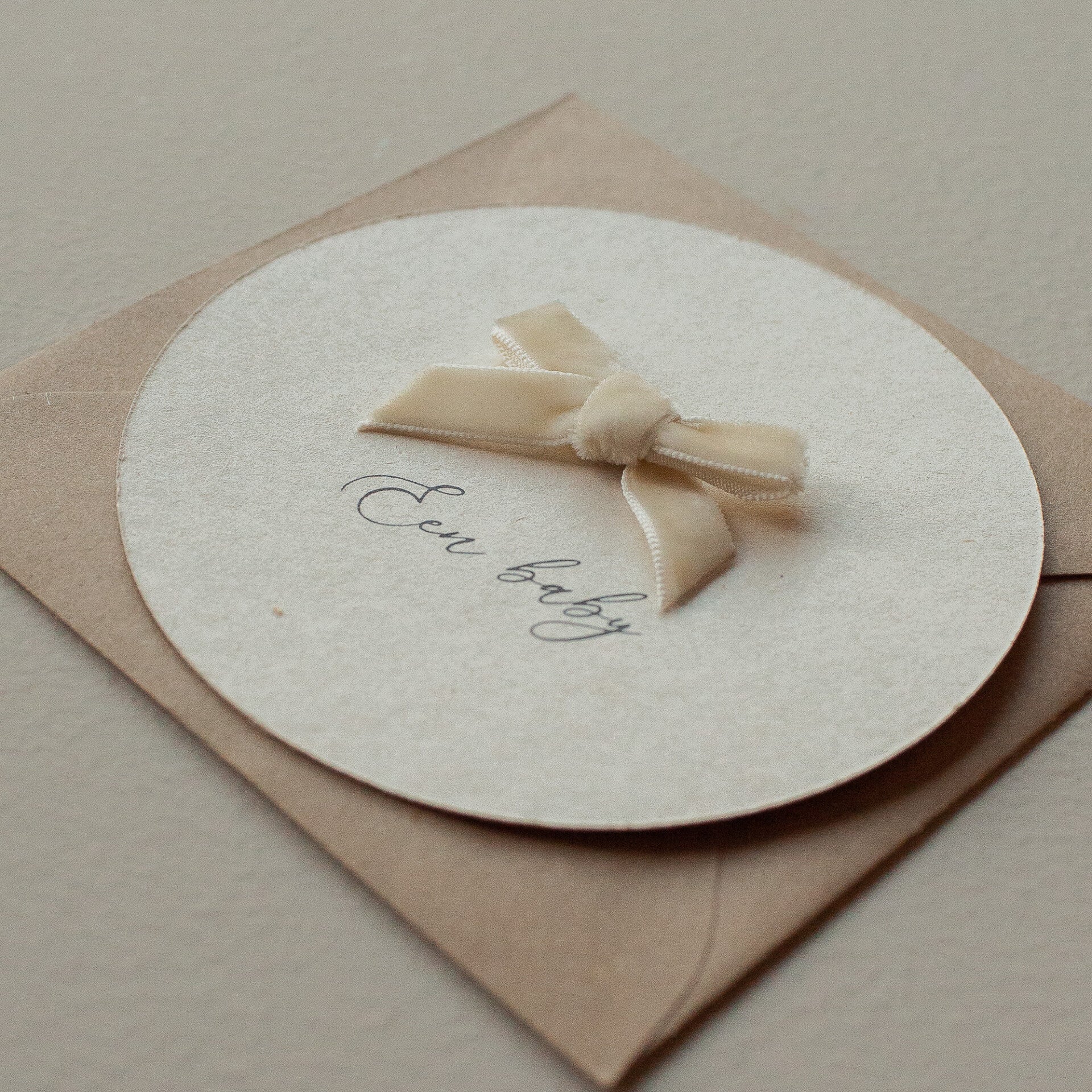 Tekst: Een babyRonde kaart op eco vezel papier (licht beige kraft), met kraft kleurige envelop.
