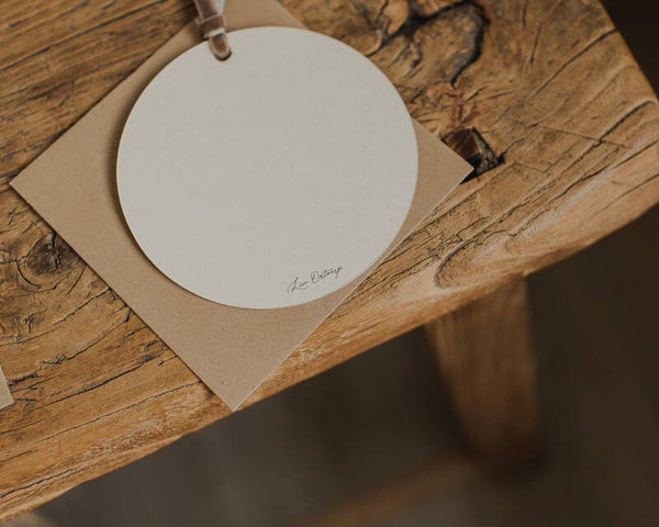 Ronde kaart, met envelop. Kaart met fluweel lintje zoals de rechtse kaart op foto.