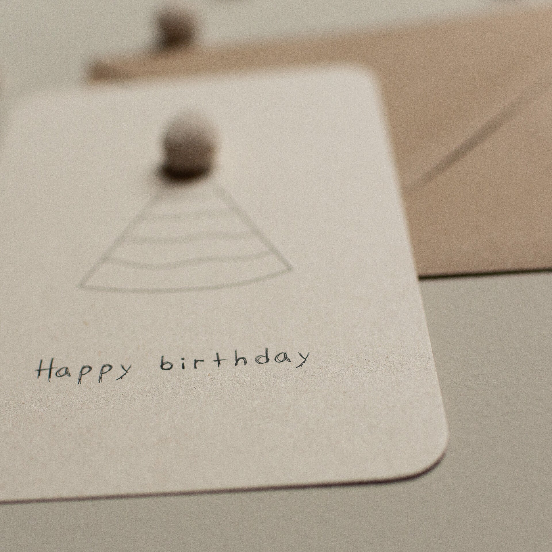 Wenskaart op eco papier, ronde hoeken met een leuke pompom op de hoed.